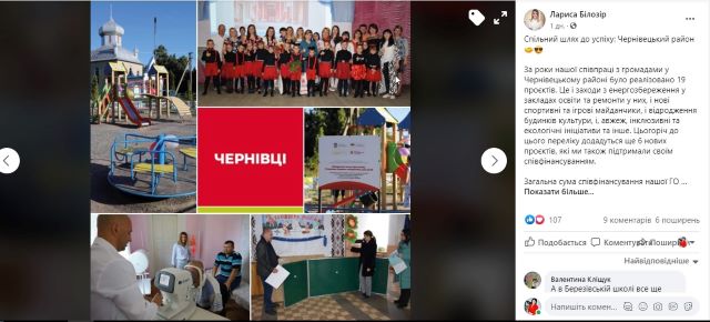 Активну доброчинну діяльність веде і народна депутатка України Лариса Білозір. На своїй сторінці у соціальній мережі Facebook вона постійно інформує про роботу в окрузі, зокрема про участь очолюваної нею ГО «Життя та розвиток громад» у співфінансуванні проєктів у населених пунктах округу.
