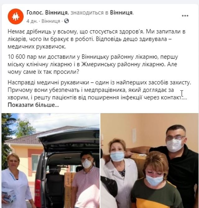 На своїй сторінці у соціальній мережі Facebook політична партія «Голос» повідомила, що передала медичні рукавички: «10 600 пар ми доставили у Вінницьку районну лікарню, першу міську клінічну лікарню і в Жмеринську районну лікарню».