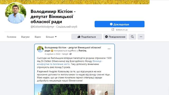 «Сьогодні на Ямпільщині вперше багатодітні родини отримали 1500 піц Dr.Oetker (Німеччина) від Благодійного Фонду Вінниця - комфортне та безпечне місто. Таку допомогу вінничани отримують вже понад 5 років», написав Володимир Кістіон, подякувавши іншому депутатові облради Андрію Ковальову, який очолює згаданий фонд.