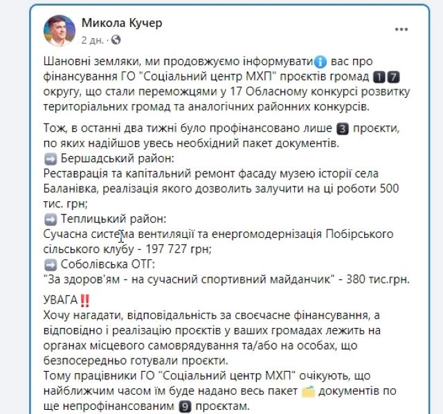 Народний депутат Микола Кучер на своїй сторінці інформує про фінаесування проєктів громад Громадською організацією «Соціальний центр МХП». «Шановні земляки, ми продовжуємо інформувати вас про фінансування ГО «Соціальний центр МХП» проєктів громад 17-го округу, що стали переможцями у 17 Обласному конкурсі розвитку територіальних громад та аналогічних районних конкурсів», - написав Микола Кучер.