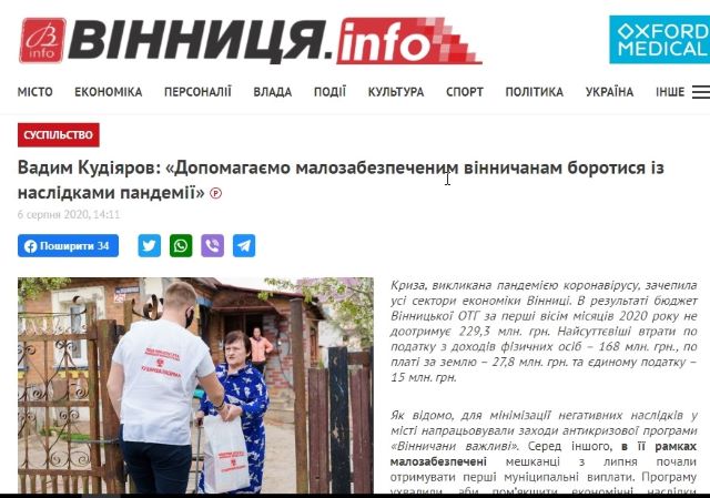 «Для малозабезпечених мешканців округу, куди входять частини мікрорайонів «Олієжиркомбінату» та «Військового містечка», підготовлена продуктова допомога. Планується, що допомогу отримають всі мешканці округу, які за нею звернуться», - зазначено в публікації, яка розміщена на одному із вінницьких сайтів (Вінниця.Інфо) з позначкою «Р» у кружечку.