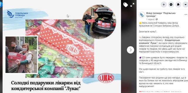 «Увесь минулий тиждень наш фонд працював як Солодка Фабрика Добра. Запитаєте чому? Завдяки солодкому вкладу від соціально-відповідального бізнесу - Кондитерська компанія «Лукас», ми мали змогу сформувати невеличкі пакунки солодощів для родин лікарів та лікарок, які увесь цей час були на передовій боротьби із коронавірусом. 3,5 тонн цукерок було передано лікарям та лікаркам у 46 медичних заклади міста Вінниці та Вінницької області», - йдеться у дописі Фонду.