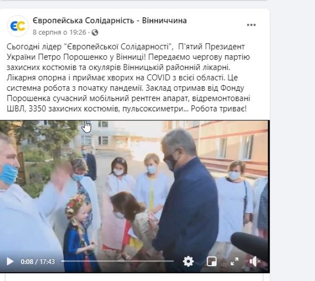 Благодійну допомогу лікарням Вінниччини надає і політична партія «Європейська Солідарність». Про цю свою діяльність вона інформує на сторінці у соціальній мережі Facebook. Також у червні та в серпні до Вінниці приїжджав Петро Порошенко, аби особисто передати лікарням області тестові системи і медичне обладнання. Також представники партії відвідували медичні заклади, відаючи лікарів зі святом Яблуневого Спасу.
