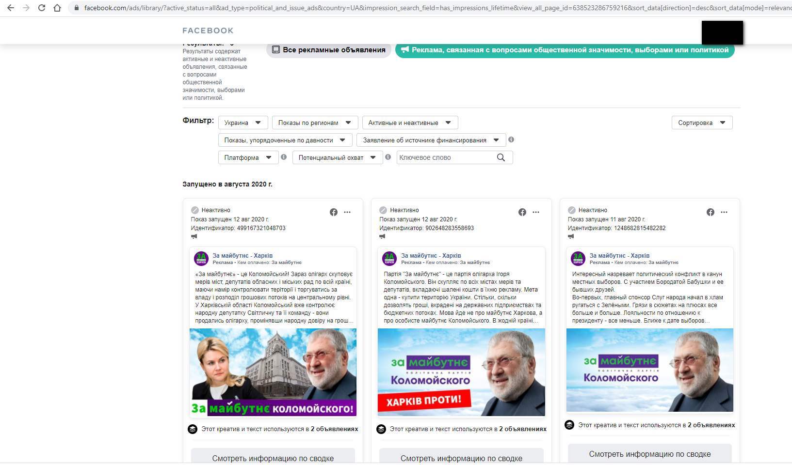 Також варто відзначити дописи з елементами «чорного піару», які рекламувався у Facebook для користувачів з Харківської області. Дописи «За майбутнє Коломойського» розповсюджувала група «За майбутнє-Харків». І на одній з ілюстрацій до посту булла зображена нардепка Світлична. Максимальна сума на розповсюдження склала 297 доларів