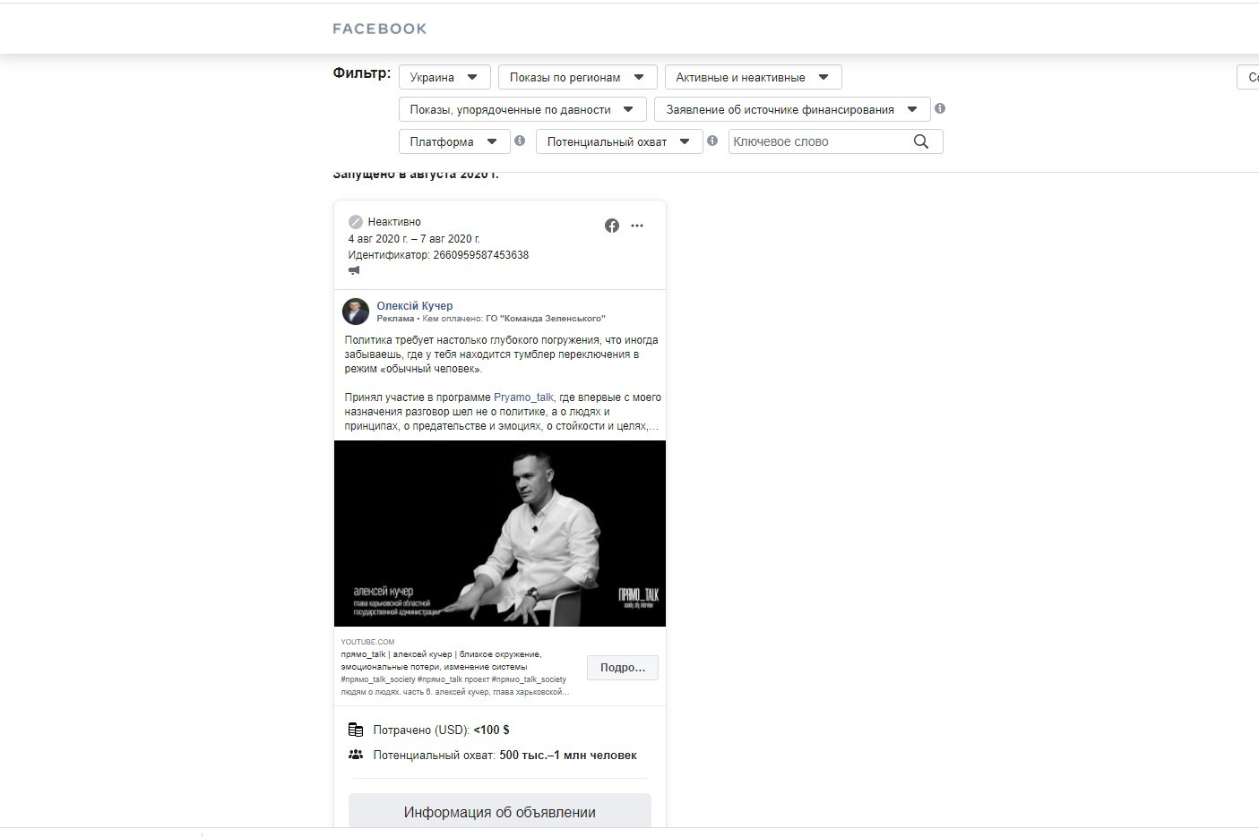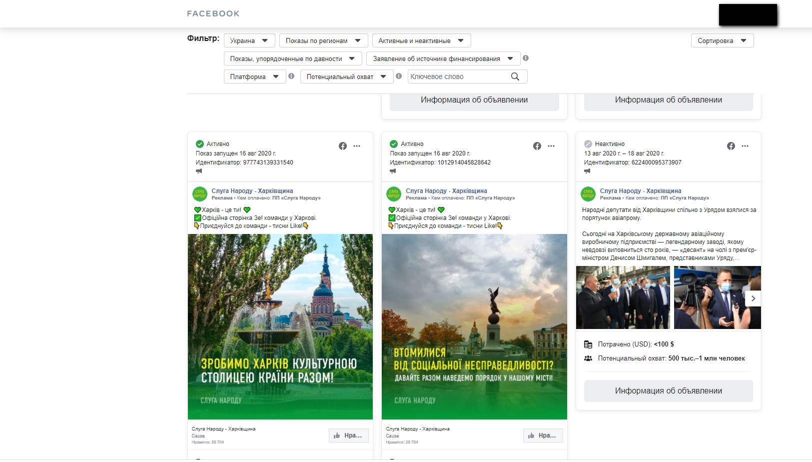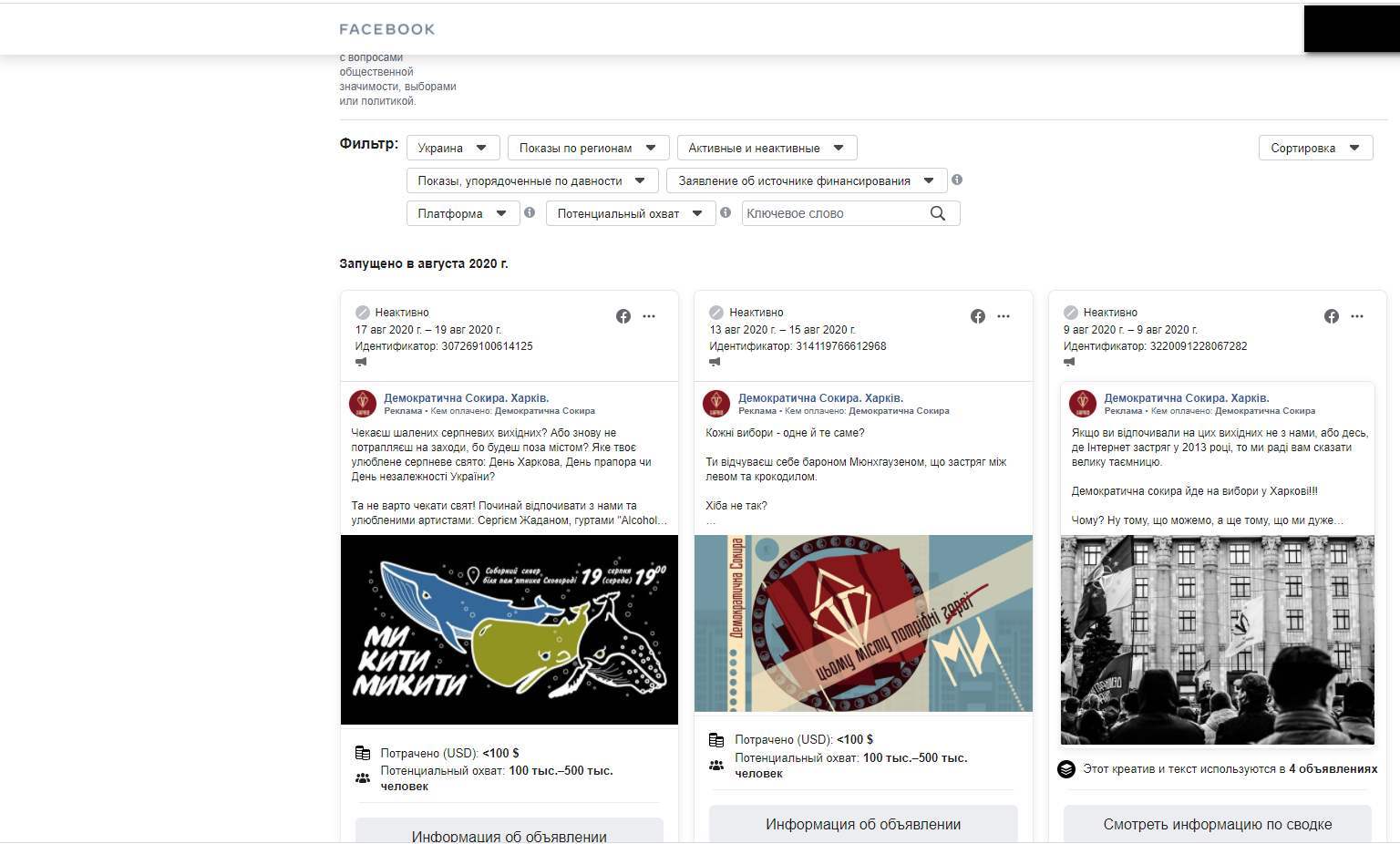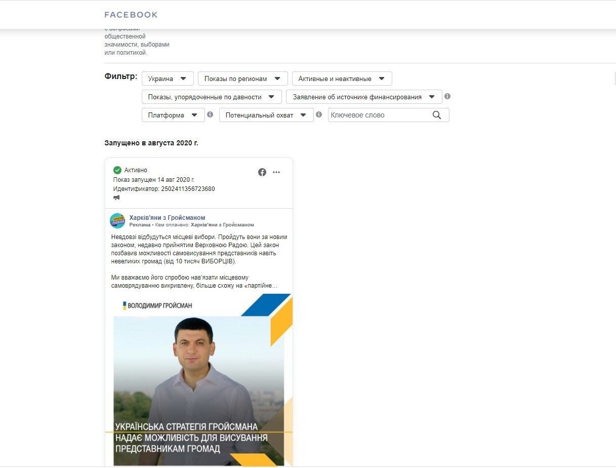 Впродовж серпня політичні партії та місцеві політики 50 разів рекламували дописи в Facebook, спрямовані на аудиторію Харкова та області, яку маркували як політичну. Рекламу в соцмережі розміщували на користь потенційних кандидатів, політичних партії, народних депутатів. Також були елементи «чорного піару». Про те, хто скористався інструментом політичної реклами та які повідомлення таргетував, йдеться в матеріалі Громадянської мережі ОПОРА.