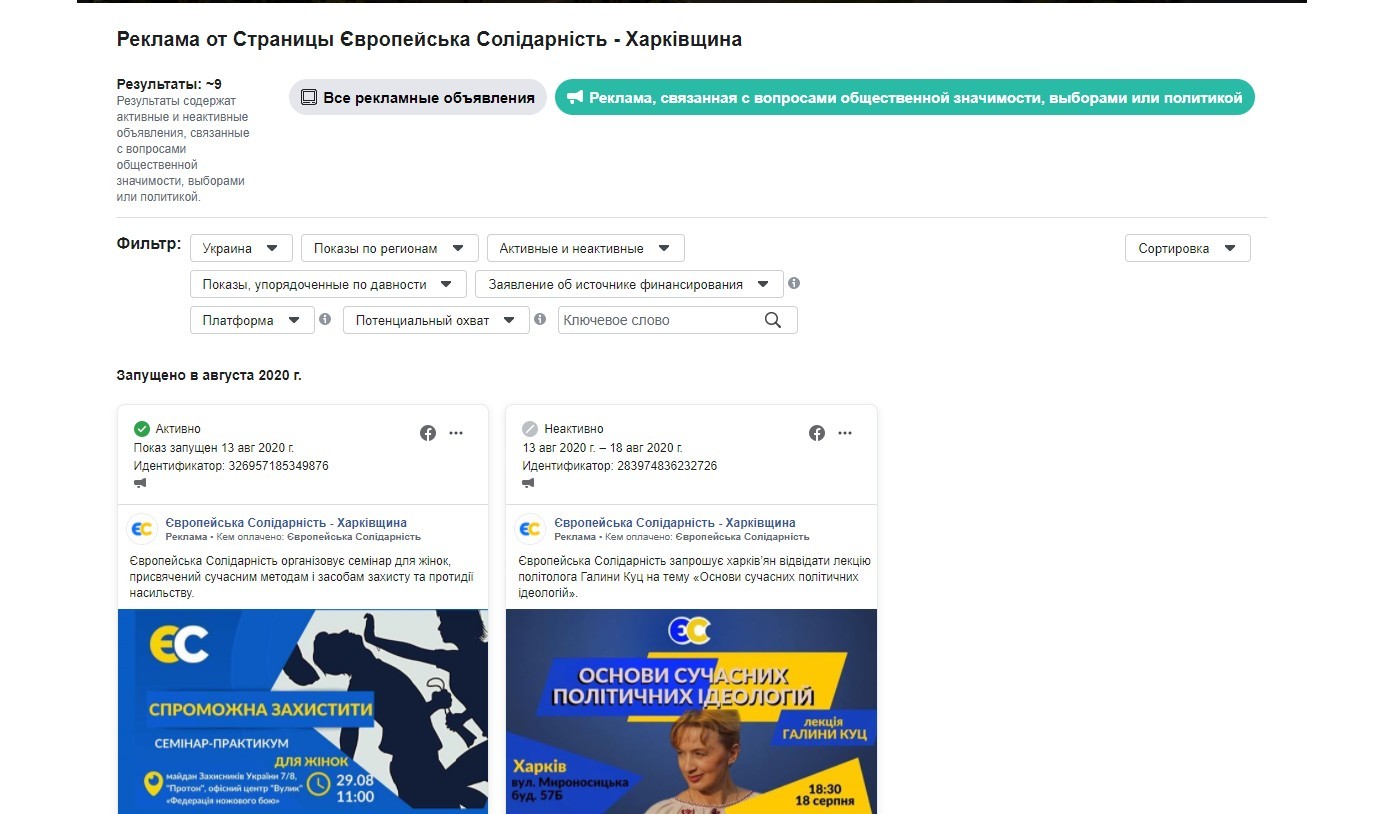 Також два заходи з представниками партії рекламували протягом серпня група«Європейськасолідарність-Харківщина».