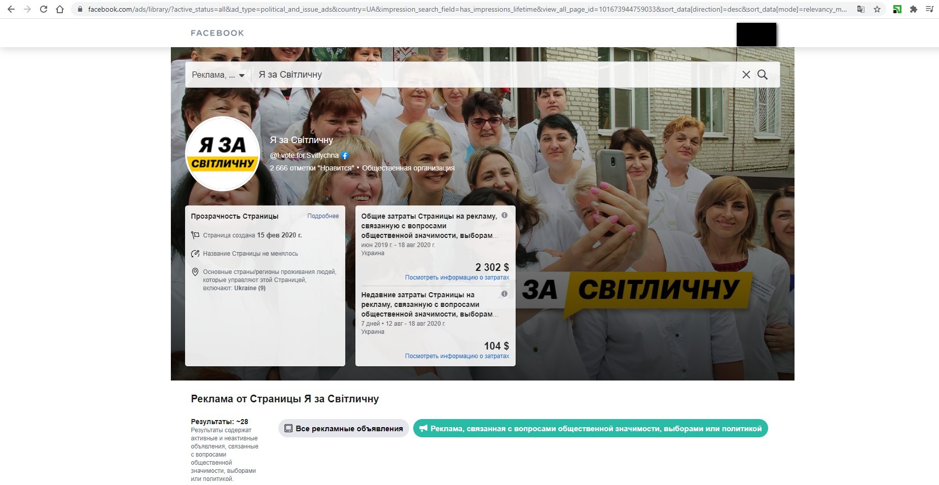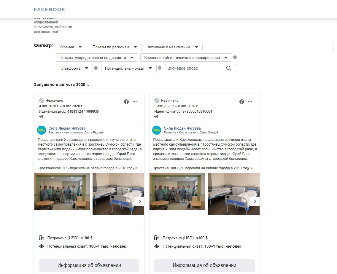 Мала два рекламні дописи і сторінка «Сила Людей Чугуєва». Дописи запрошували стати депутатом в місті Чугуїв. Вартість реклами не перевищувала 198 долаів США.