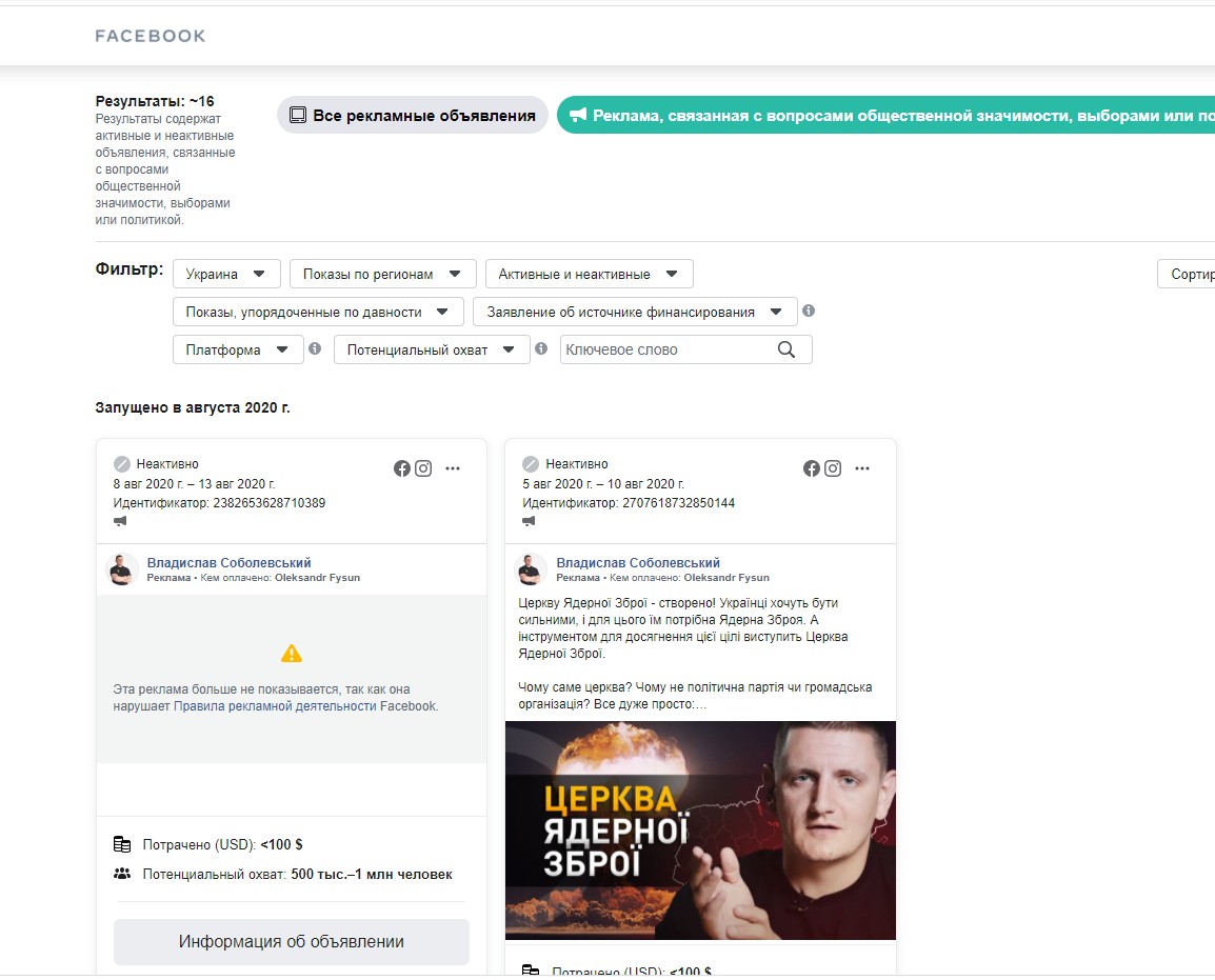 Два рекламні дописи мав Владислав Соболевський з «Азову», який агітує за повернення ядерного статусуУкраїни. Один з його постів Facebook заблокував, як такий, що порушує вимоги соціальної мережі.