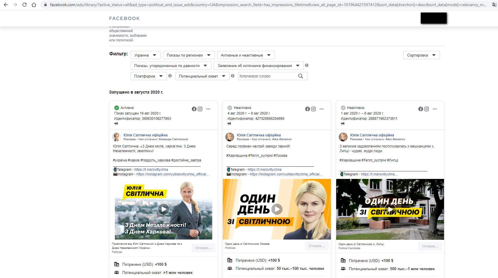 Активно використовує інструмент політичної реклами народна депутатка України Юлія Світлична. По 5 рекламних дописів зафіксовані на сторінці «Команда Світличної Харківщина» та «Я за Світличну» . Решта на офіційній сторінці політика. .