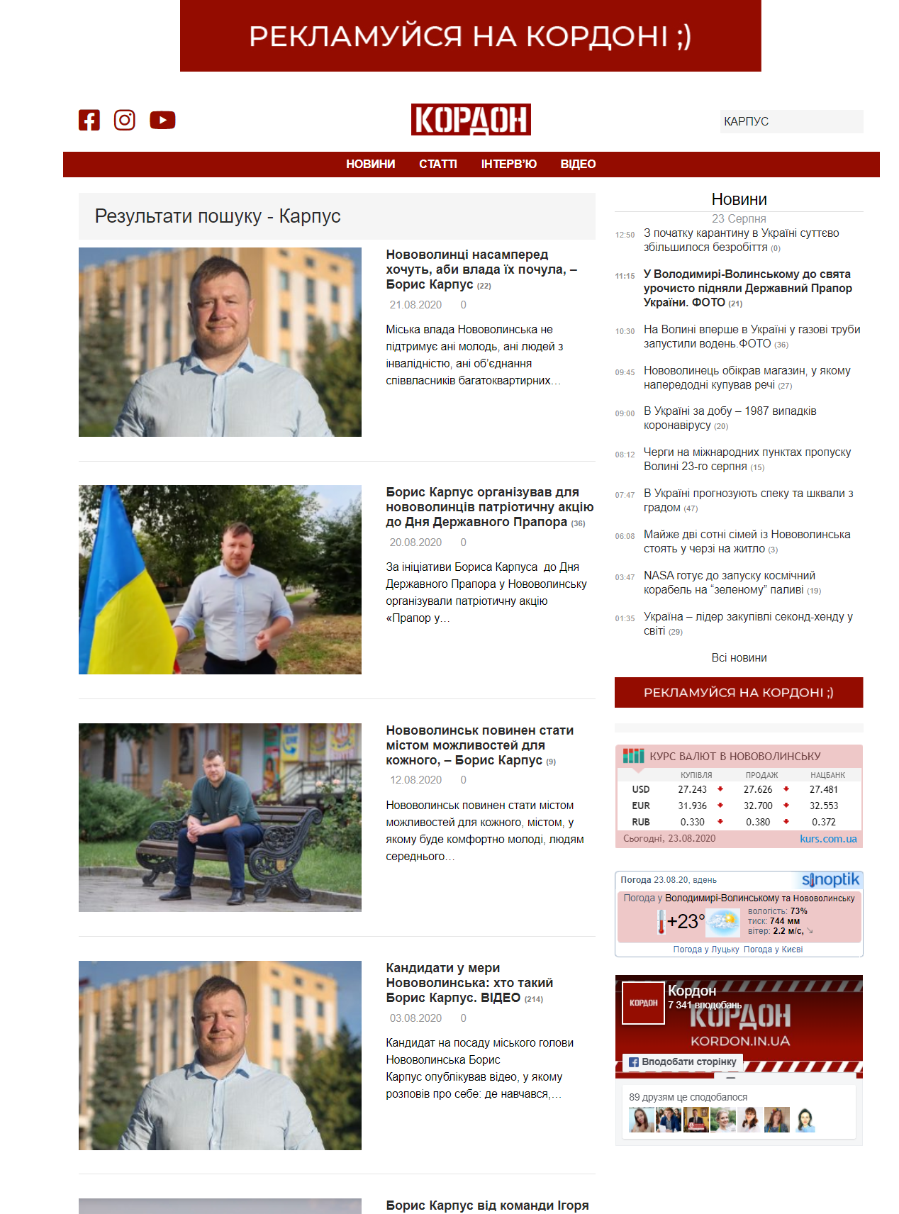 Усі тексти стосувалися ініціатив Бориса Карпуса, як то запуск автобуса у Нововолинську, можливості отримати прапор до Дня незалежності, або ж його позицій спілкування із міською владою, рейтингу підтримки серед нововолинців тощо. Видання також розмістили ефір нардепа Ігоря Гузя, на якому був присутній та висловлювався з питань медицини й потенційний кандидат.