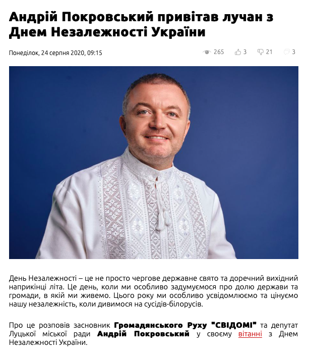 Ще 6 згадок мають потенційні кандидати від Руху – Андрій Покровський, Тарас Шкітер та Алла Надточій, – а заразом і сама партія, на сторінках видання «Волинь24». Вони стосувалися меж карантинної зони, роботи комунального підприємства «Луцьктепло», закликів взяти участь в онлайн-голосуванні за тих, хто може стати кандидатом від «Громадянського руху «Свідомі».