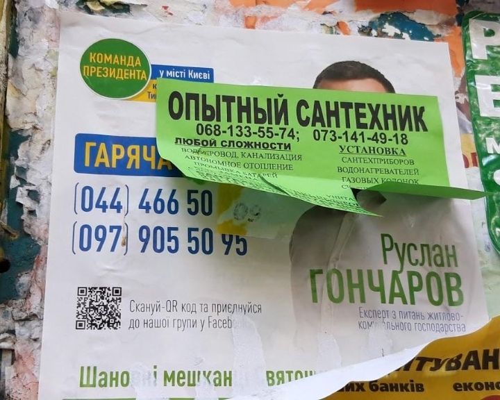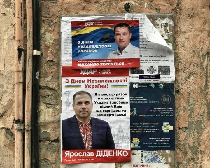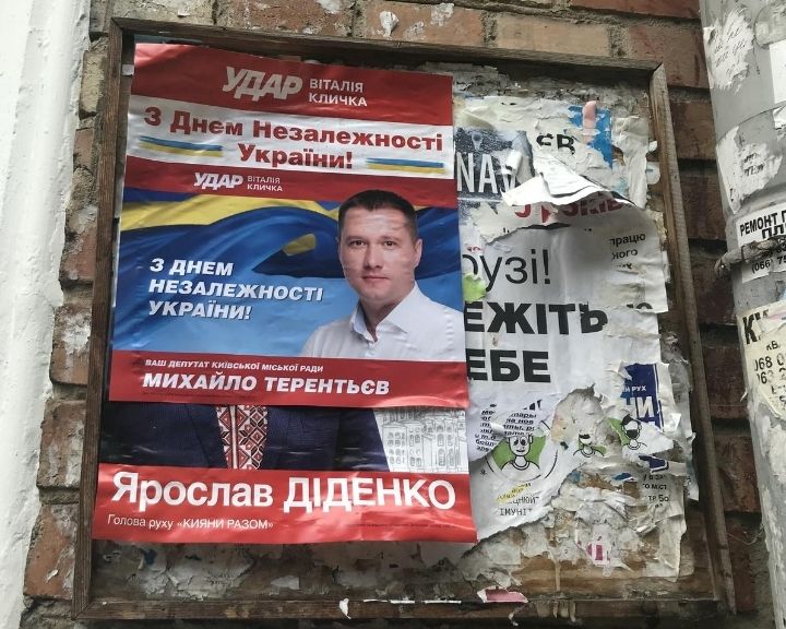 Між двома політиками з УДАРу на дошках оголошень Печерська розпочалась «битва плакатами». У Ярослава Діденка (депутат Київради, фракція «Солідарність») поліграфія більша, зате зображення Михайла Терентьєва (депутат Київради, теж фракція «Солідарність») просто наклеюють зверху.
