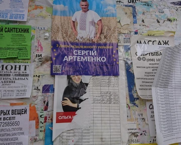 На дошках оголошень Дніпровського району з Днем Незалежності людей вітає депутат Київради від «Солідарності» Сергій Артеменко. Коли спостерігачка ОПОРИ фіксувала плакати, вони не були пошкоджені.
