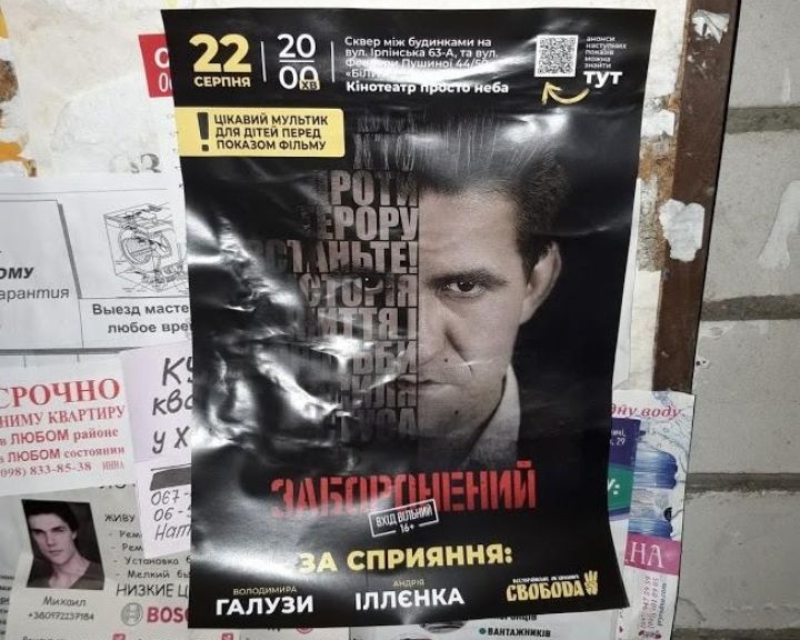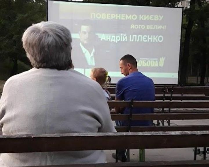 Також «Свобода» інформує про свої традиційні кінопокази просто неба – з тою різницею, що тепер перед фільмом глядачі дивляться ролики з політичною рекламою Андрія Іллєнка, кандидата на пост мера столиці.