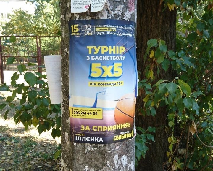 У Деснянському районі зі стовпів можна було дізнатись, що Андрій Іллєнко від «Свободи» сприяє проведенню баскетбольного турніру.