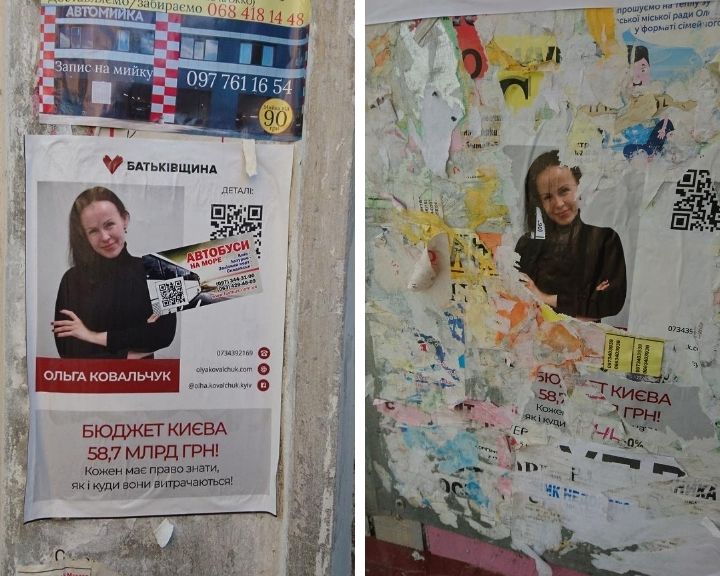 У Дніпровському районі Києва спостерігачі зафіксували пошкоджені листівки із зображенням Ольги Ковальчук та вказанням політичної сили – «Батьківщина». У коментарі ОПОРІ політикиня процитувала законодавство, а потім зазначила, що рішення про те, хто братиме участь у виборах до Київради, прийматиме міська партійна організація у визначений законодавством термін.