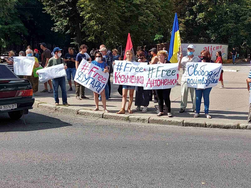 Під час заходу протестували кропивничани, вони тримали в руках плакати з написом: «FreeКузьменко», «Волю політв’язням», «Free Антоненко» та інші.