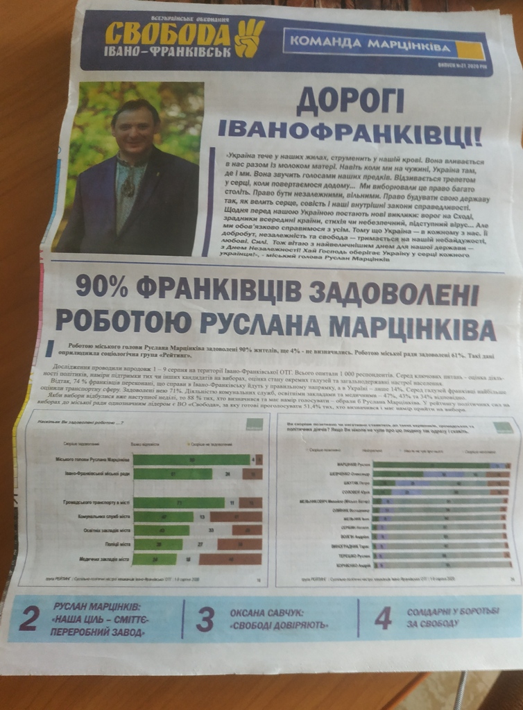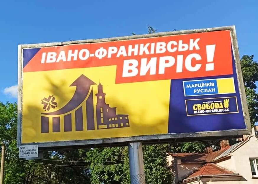 В Івано-Франківську чимало білбордів є із згадкою, як партії ВО «Свобода» так і міського голови обласного центру Руслана Марцінківа. Наприклад, «Івано Франківськ виріс» та «Нові маршрути №53 № 54 з вулиці Хоткевича».