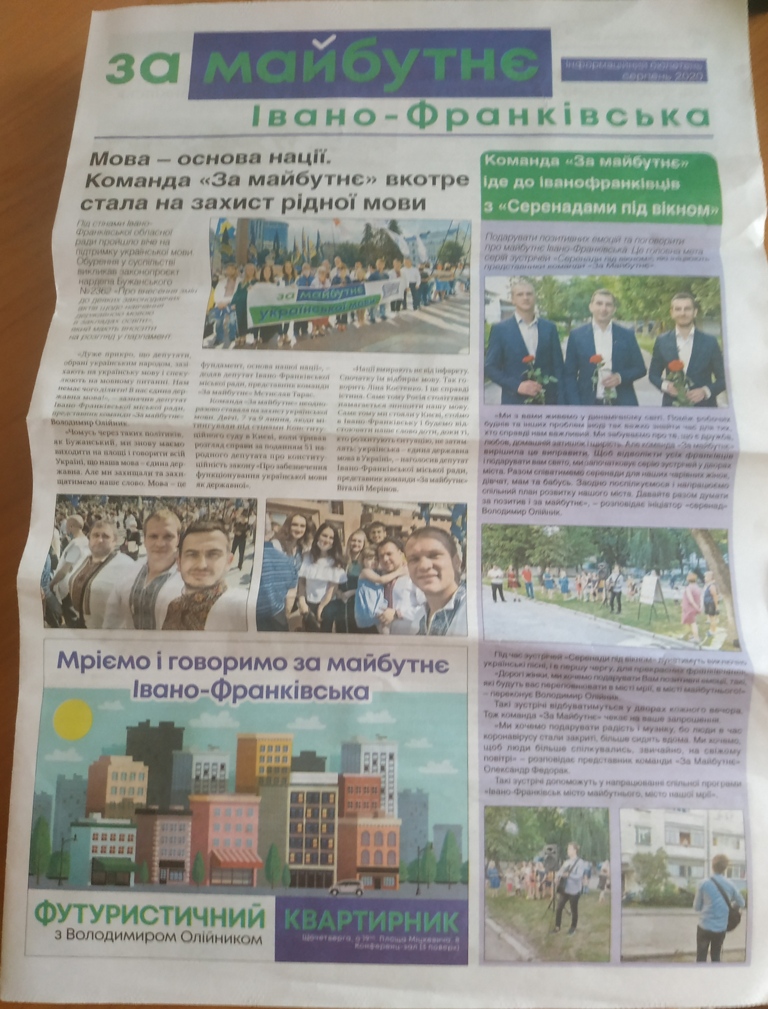 А от команда «За майбутнє» проводить акції «Серенади під вікном», на яких депутати Івано-Франківської міської ради Володимир Олійник, Віталій Мерінов та Мстислав Тарас зустрічаються із мешканцями багатоповерхівок.