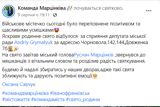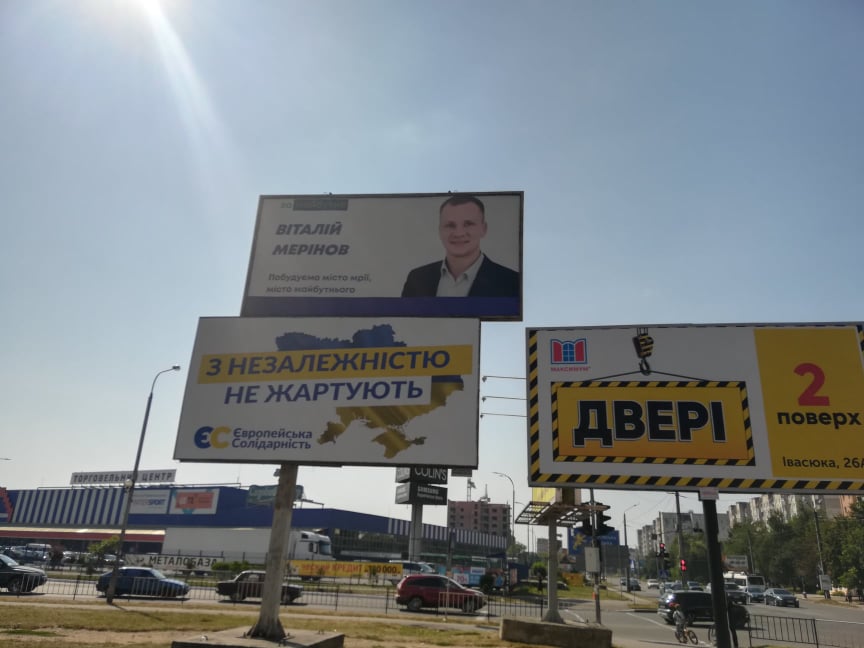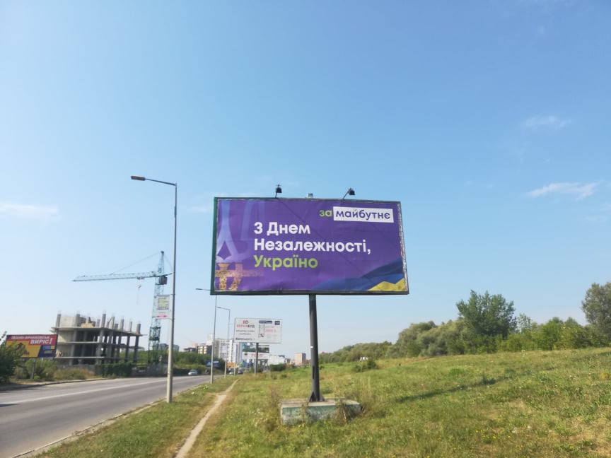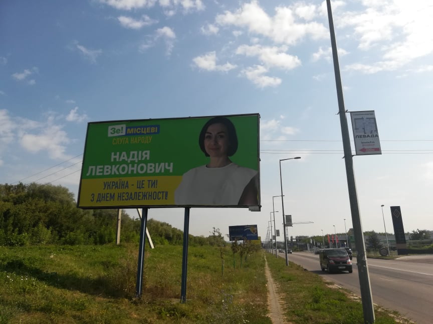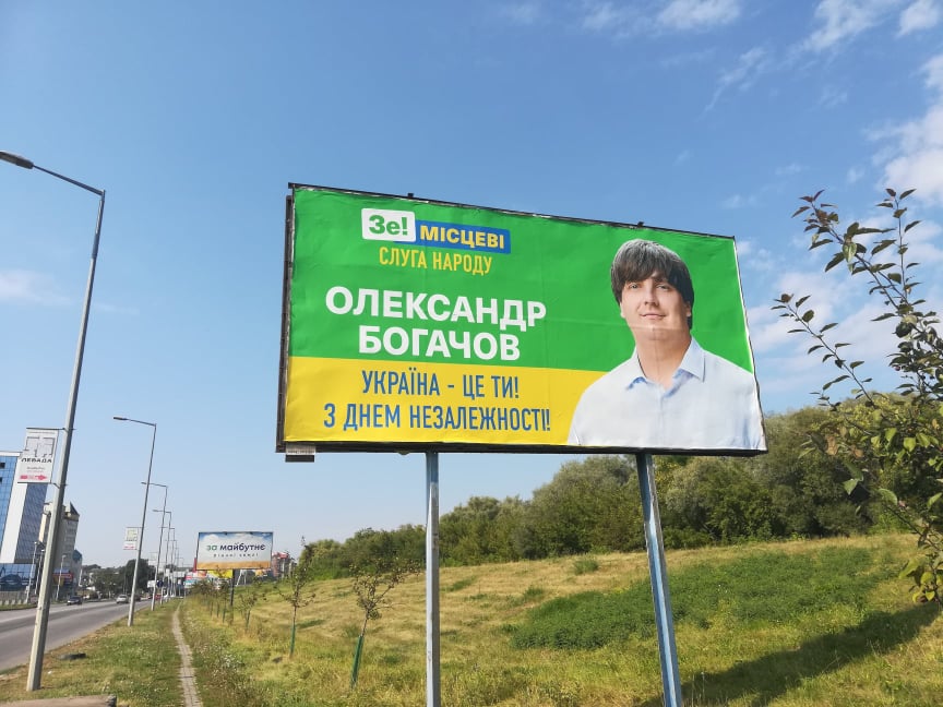 Так само про зовнішню політичну рекламу не забули представники партії «Слуга народу». Наприклад, ОПОРА зафіксувала привітання з Днем Незалежності від Олександра Богачова та Надії Левконович.