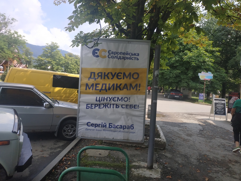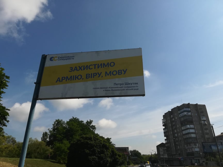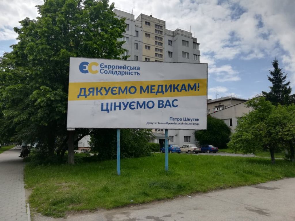 Не забувають і про зовнішню рекламу окремі політичні діячі. Наприклад у серпні з’явилися білборди та сітілайти від депутата Івано-Франківської міської ради Петра Шкутяка: «Дякуємо медикам! Цінуємо Вас». Ще на одному білборді від Шкутяка надпис: «Захистимо армію, мову, віру».