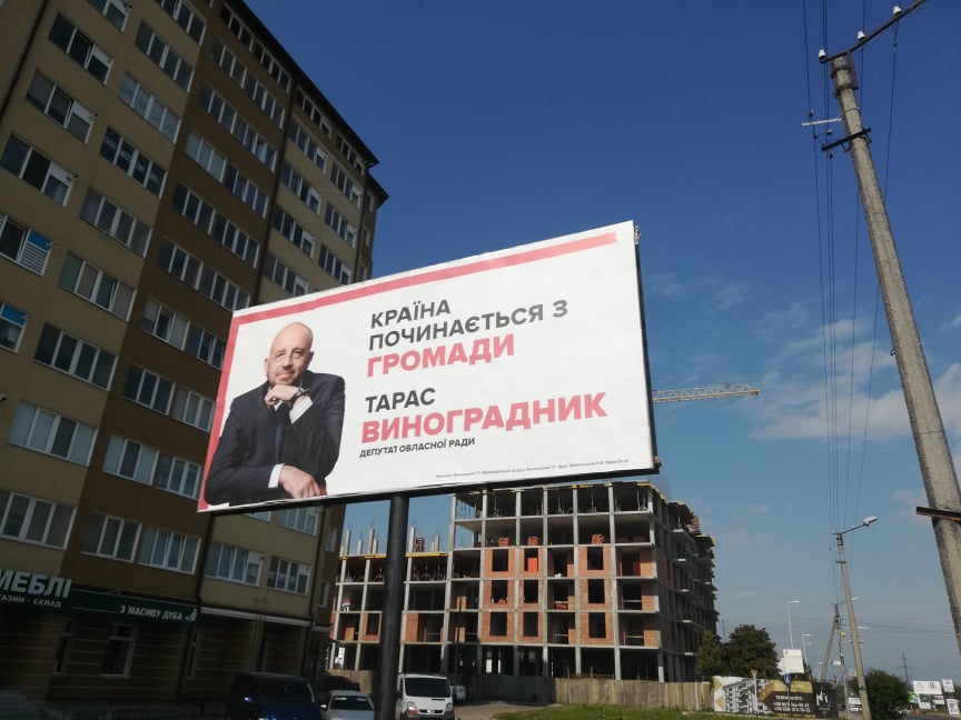 Депутат обласної ради Тарас Виноградник на своєму білборді написав – «Країна починається з громади».