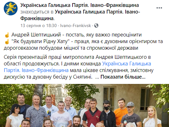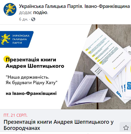 Натомість «Українська Галицька партія» презентує книгу Андеря Шептицького «Як будувати рідну хату» у населених пунктах області (Верховина, Богородчани, Бурштин, Снятині).