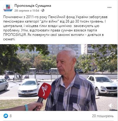 «Починаючи з 2011-го року Пенсійний фонд України заборгував пенсіонерам категорії «діти війни» від 26 до 30 тисяч гривень. І центральна, і місцева гілки влади цинічно замовчують цю проблему. Утім, відстоювати права сумчан взялася партія ПРОПОЗИЦІЯ», - йдеться в дописі від 28 серпня на офіційній сторінці «Пропозиція Сумщина» у Facebook.