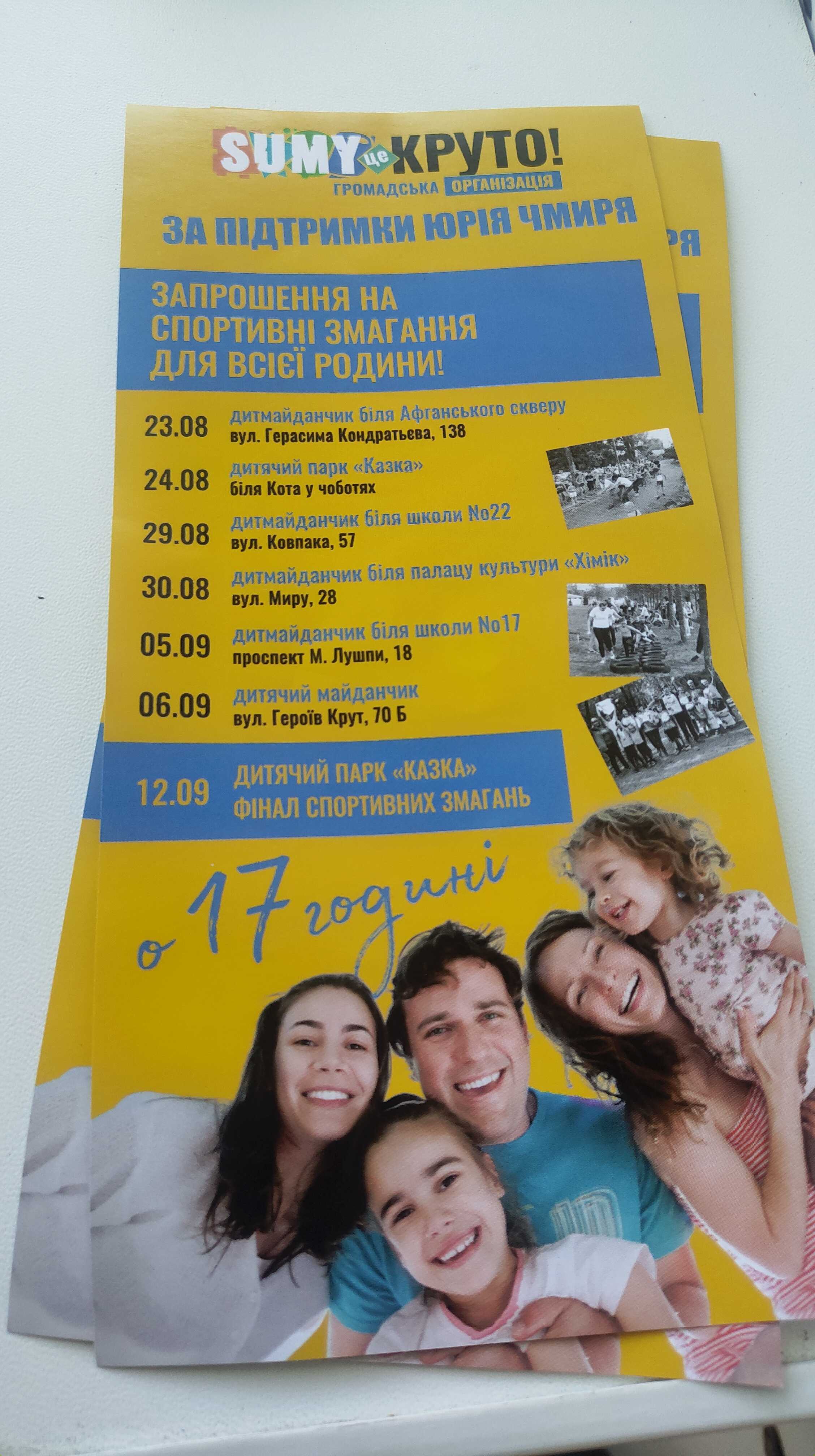 Як вже раніше повідомляла ОПОРА, в Сумах з’явились намети громадської організації «SUMY - це круто», де проводять опитування щодо потенційного кандидата на місцевих виборах, Юрія Чмиря. Ця ж організація проводить спортивні змагання в різних районах міста, на флаєрах вказано: «За підтримки Юрія Чмиря». Зокрема, на заходах, які відбулись 24 серпня в сквері «Дружба» та 29 серпня за адресою вул. Ковпака 159 на території школи №22, були присутні спостерігачі ОПОРИ.