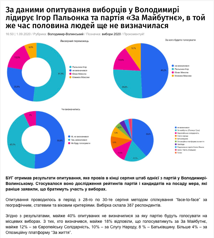 У матеріалі йдеться, що видання отримало результати опитування, «яке провів в кінці серпня штаб однієї з партій у Володимирі-Волинському. Стосувалося воно дослідження рейтингів партій і кандидатів на посаду мера, які раніше заявили, що братимуть участь у виборах». Тут зазначений час, метод, територія проведення, обсяг вибірки та питання, які ставили респондентам, однак немає інформації про замовника дослідження та виконавця.