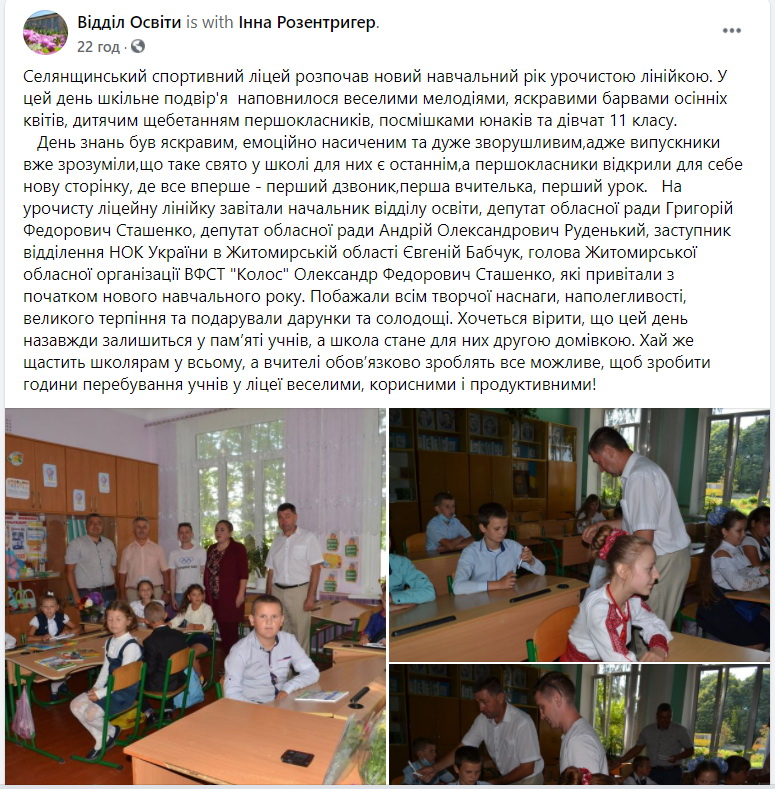 “На урочисту ліцейну лінійку завітали начальник відділу освіти, депутат обласної ради Григорій Федорович Сташенко, депутат обласної ради Андрій Олександрович Руденький, заступник відділення НОК України в Житомирській області Євгеній Бабчук, голова Житомирської обласної організації ВФСТ "Колос" Олександр Федорович Сташенко, які привітали з початком нового навчального року. Побажали всім творчої наснаги, наполегливості, великого терпіння та подарували дарунки та солодощі”, – повідомляють на сторінці місцевого відділу освіти.
