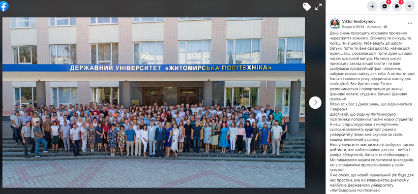 Потенційний кандидат в мери від партії “Слуга народу” Віктор Євдокимов на своїй сторінці соцмережі привітав усіх з початком нового навчального року. Віктор Євдокимов є ректором університету “Житомирська політехніка”. З вітальними словами розмістив фото колективу університету.