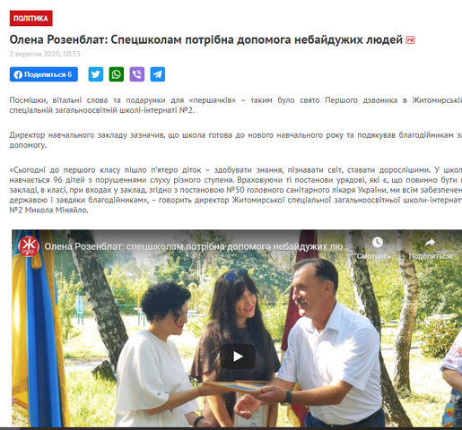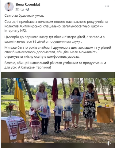 “Сьогодні привітала з початком нового навчального року учнів та колектив Житомирської спеціальної загальноосвітньої школи-інтернату №2. Цьогоріч до першого класу тут пішли п'ятеро дітей, а загалом в школі навчається 96 дітей з порушеннями слуху. Ми вже багато років знайомі і дружимо з цим закладом та у різний спосіб намагаємось допомагати, аби діти мали можливість отримувати якісну освіту в комфортних умовах. Бажаю, аби цей навчальний рік став успішним та продуктивним для усіх. А батькам- терпіння!”, – написала Олена Розенблат на своїй сторінці у Facebook.