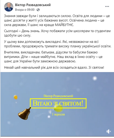 Керівник обласного осередку політичної партії “За майбутнє” Віктор Развадовський на своїй сторінці в соцмережі розмістив вітання з Днем знань. А його колеги по партії “представник команди народного депутата України 4-х скликань Віктора Развадовського” відвідали святкову лінійку у Левківській загальноосвітній школі І-ІІІ ступенів.