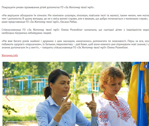 2 вересня на місцевому сайті Житомир.info з'явилась публікація з позначкою “PR” під заголовком: “Олена Розенблат: Спецшколам потрібна допомога небайдужих людей”. У матеріалі зазначено, ГО “За Житомир твоєї мрії”, співзасновницею якої є Олена Розенблат, допомогла “покращити умови проживання дітей”.