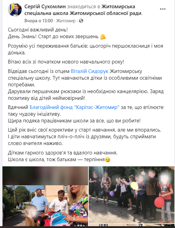 “Відвідав сьогодні із отцем Віталій Сидорук Житомирську спеціальну школу. Тут навчаються дітки із особливими освітніми потребами. Дарували першачкам рюкзаки із необхідною канцелярією. Заряд позитиву від дітей неймовірний! Вдячний Благодійний фонд "Карітас-Житомир" за те, що втілюєте таку чудову ініціативу. Щира подяка працівникам школи за все, що ви робите!”, – написав Сергій Сухомлин.