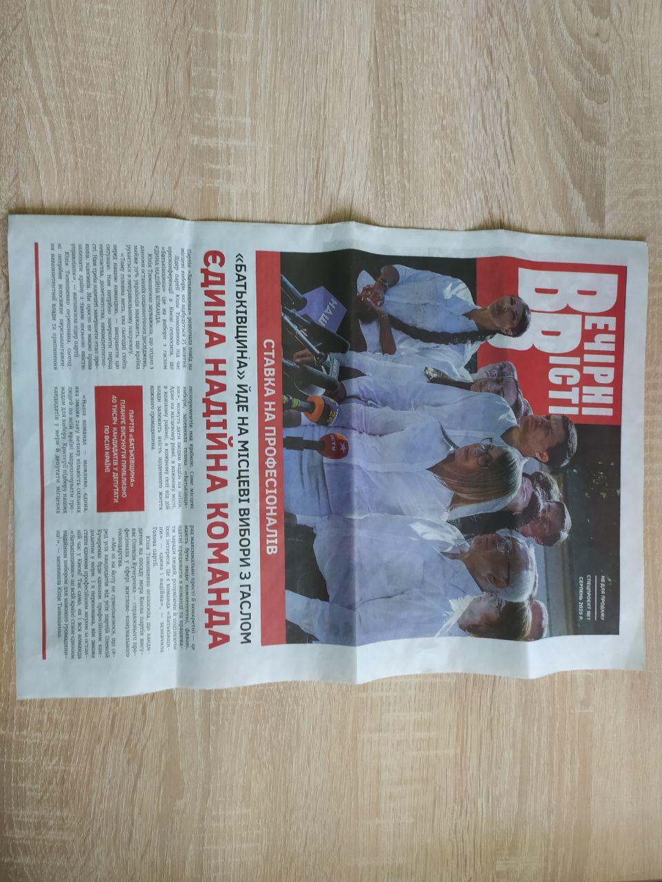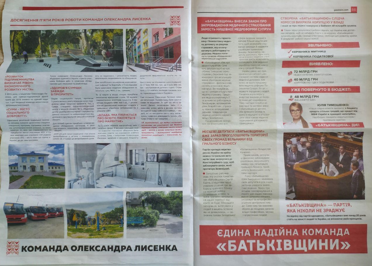 На одній із зустрічей з громадянами (26 серпня), про які ОПОРА вже писала, жителям міста роздавали газету «Вечірні вісті», на головній шпальті газети розміщена стаття із назвою: «Ставка на професіоналів. «Батьківщина» йде на вибори з гаслом єдина надійна команда», в середині газети є вкладення із статтею під назвою «Місто змінюється. Досягнення п’яти років роботи команди Олександра Лисенка» із символікою, схожою на символіку ВО «Батьківщина».