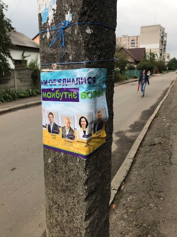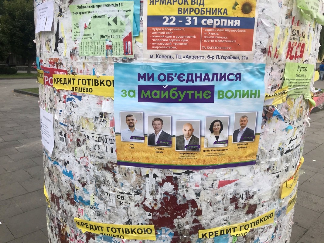 Також 6 вересня у місті Ковель виявили листівки в місцях, спеціально передбачених для розміщення агітації відповідно до розпорядження міського голови №174-р. Йдеться про листівки «Ми об’єдналися За майбутнє Волині» із зображеннями та іменами п’яти народних депутатів – Ігоря Палиці (очільник партію «За майбутнє»), Ірини Констанкевич (котра тут зазначена як голова волинського осередку партії), Ігоря Гузя, Степана Івахіва та Вячеслава Рубльова.