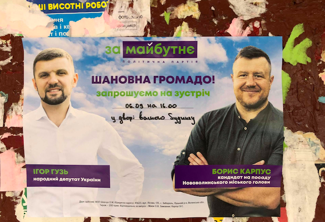 На одній з дошок для розміщення оголошень у місті Нововолинську представники ОПОРИ виявили листівку із зображенням чинного нардепа від округу №19, одного з лідерів партії «За майбутнє» Ігоря Гузя та потенційного кандидата на посаду Нововолинського міського голови від цієї ж партії Бориса Карпуса. Листівка містили логотип партії і текст такого змісту: «Шановна громадо! Запрошуємо на зустріч 06.09. о 16:00 у дворі вашого будинку».