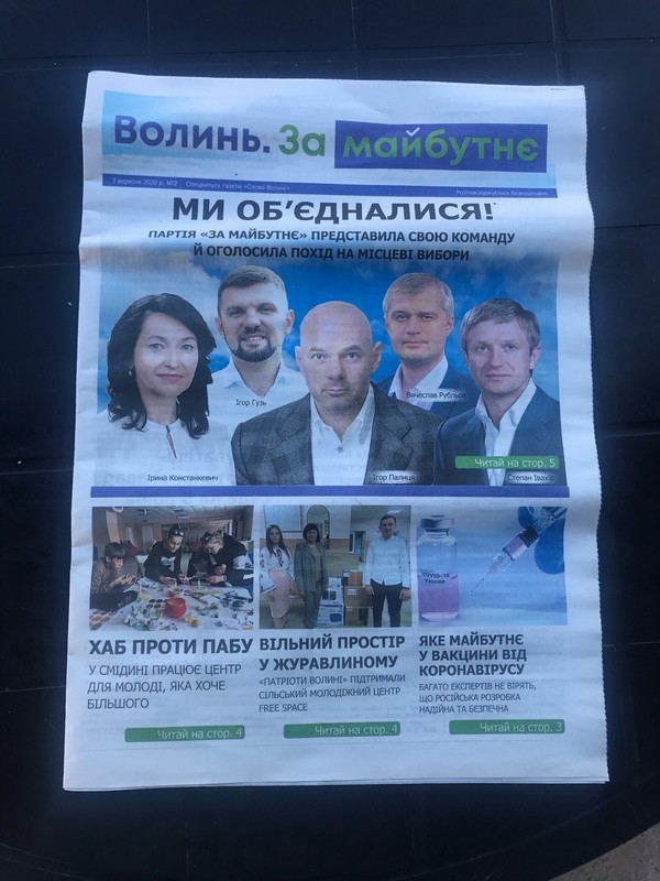 На першій шпальті газети над колажем із зображенням нардепів написано «Ми об’єдналися! Партія «За майбутнє» представила свою команду й оголосила похід на місцеві вибори». Всередині видання – низка новин стосовно карантину, онлайн навчання, ДТП, вакцинацію тощо. Також тут міститься вітання нардепа Степана Івахіва з нагоди Дня знань, а також розповідається про проекти за підтримки його благодійного фонду «Патріоти Волині». Ще одна сторінка присвячена висвітленню Всеукраїнського з’їзду партії «За майбутнє», котрий відбувся у Києві.