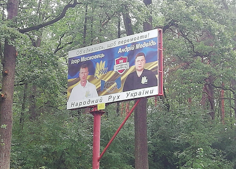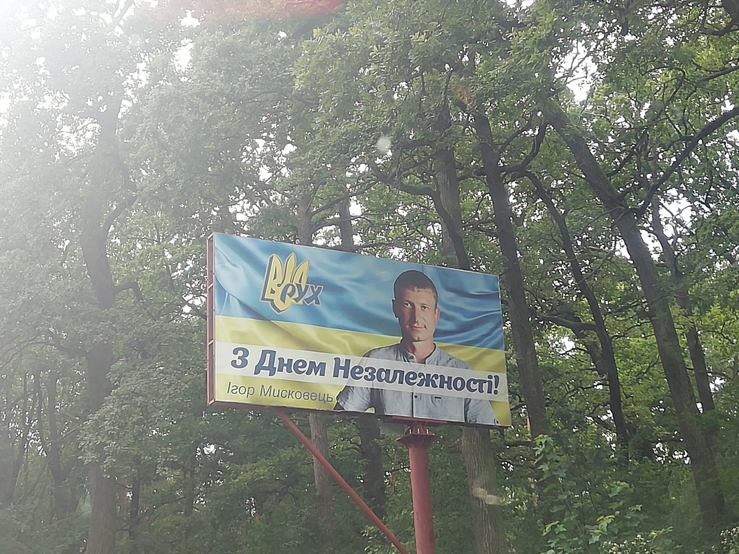 Також поблизу міста Ківерці зафіксували білборд-вітання із Днем Незалежності. На плакаті на тлі прапора розміщене саме вітання, фото та ім’я Ігоря Мисковця – представника Народного Руху України. На іншому матеріалі, виявленому поблизу цього ж населеного пункту, містились зображення двох потенційних кандидатів – Ігоря Мисковця (Народний Рух України) та Андрія Медвідя («Громадський рух «Народний контроль»). На білборді також зазначено: «Об’єднались, щоб перемогти!».