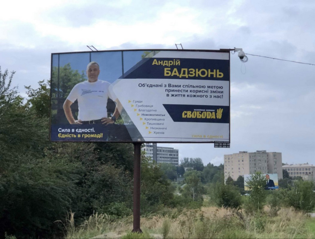 У Нововолинську натомість розмістили білборди потенційного кандидата Андрія Бадзюня із його фото, партійним лого ВО «Свобода» та гаслами «Сила в єдності! Єдність в громаді!» і «Об’єднані з Вами спільною метою принести корисні зміни в життя кожного з нас!».