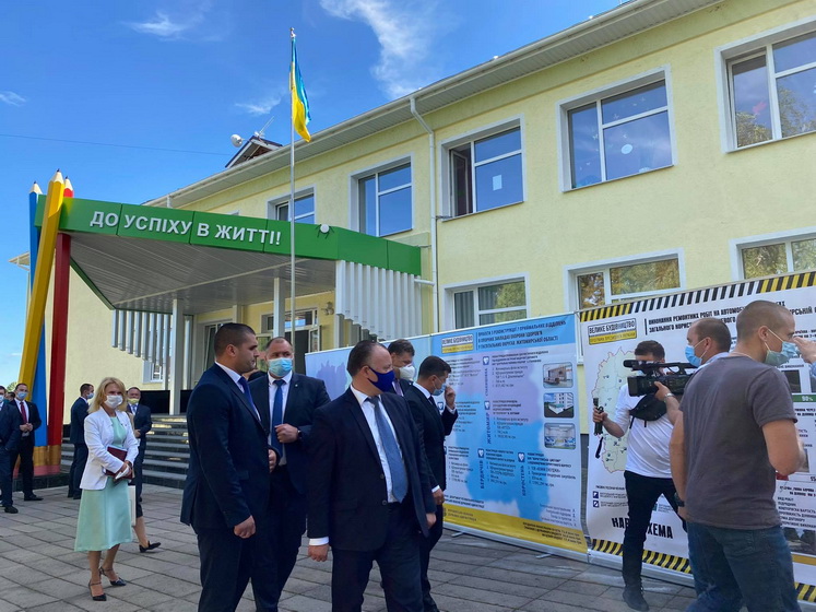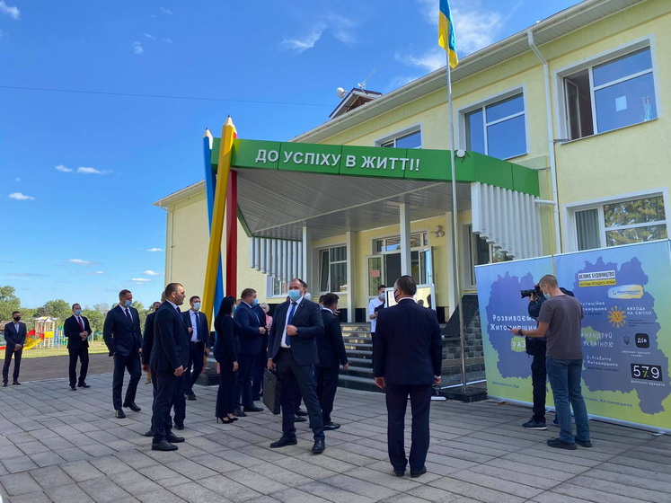 У Високівській територіальній громаді президента зустрічали десятки місцевих жителів. Володимир Зеленський у супроводі голови Житомирської ОДА Віталія Бунечка та керівництва громади оглянув гімназію, спортивний майданчик та амбулаторію, які відремонтовані в рамках проєкту “Велике будівництво”.