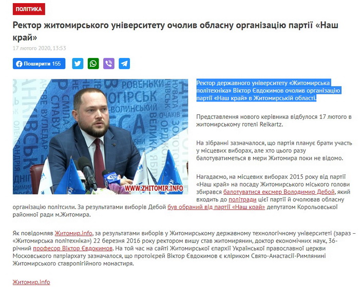 Ректором університету “Житомирська політехніка” є Віктор Євдокимов, якого 31 серпня на з'їзді партія висунула кандидатом в мери Житомира. У лютому 2020 року Віктор Євдокимов очолював організацію партії "Наш край" в Житомирській області. На той час на сайті Житомирської єпархії Української православної церкви Московського патріархату зазначалося, що протоієрей Віктор Євдокимов є кліриком Свято-Анастасії-Римлянині Житомирського ставропігійного монастиря.