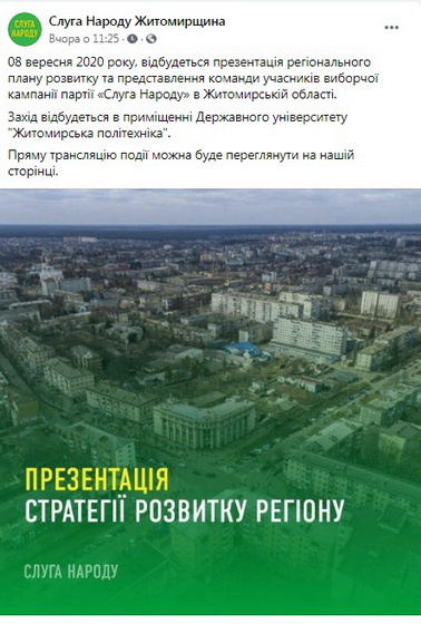 Натомість на сторінці партії “Слуга народу Житомирщина” у Facebook анонсували презентацію регіонального плану розвитку та представлення команди учасників виборчої кампанії партії "Слуга Народу".