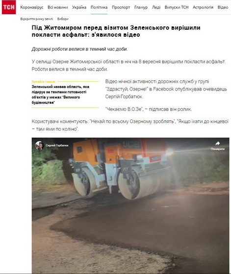 Вранці на сайті ТСН з'явилися публікації під заголовком: “Під Житомиром перед візитом Зеленського вирішили покласти асфальт: з'явилося відео”.