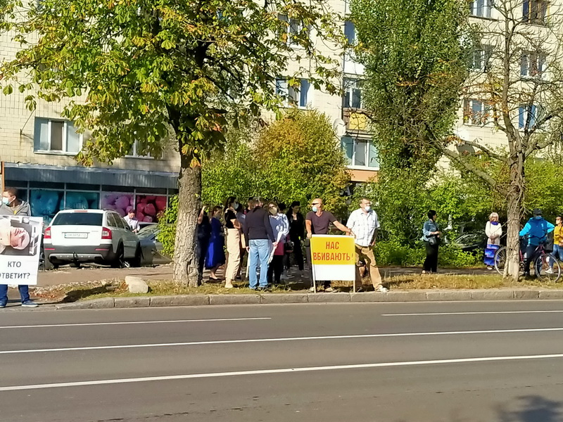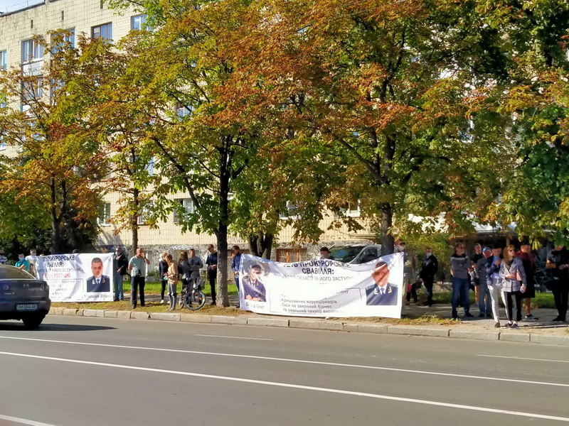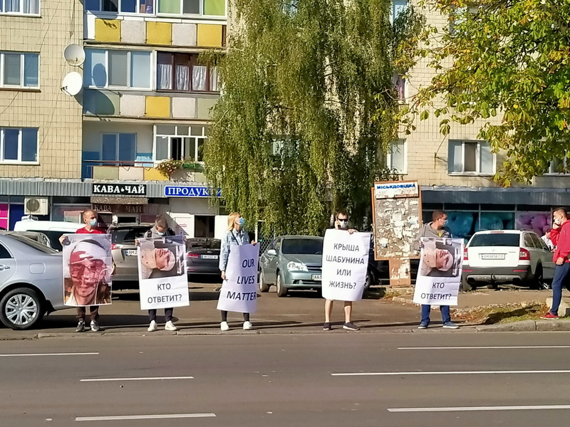 Хлопці в масках тримали кілька плакатів з написами: «Геть прокурорське свавілля: прокурор області та його заступник не пройшли атестацію». Присутні люди з плакатами «Оur lives matter», «Крыша Шабунина или жизнь?», «Кто ответит?».