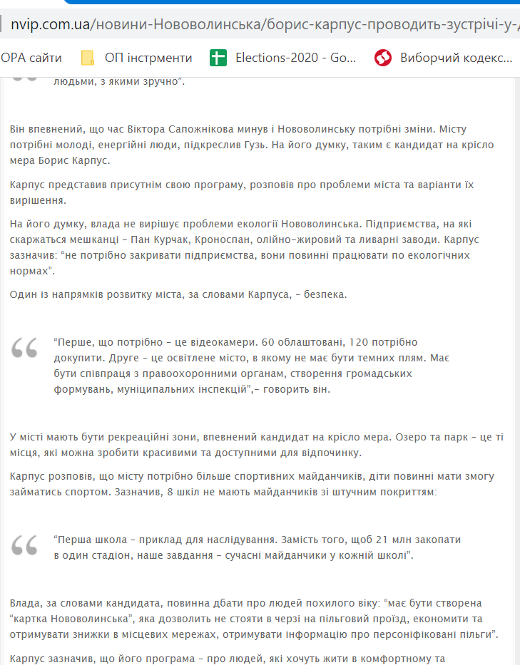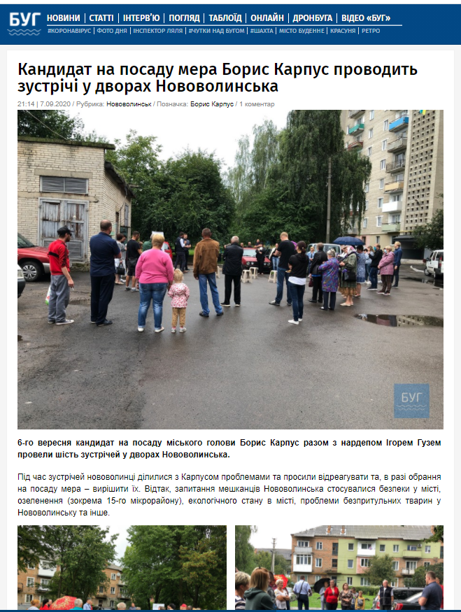 7 вересня інтернет-видання «БУГ» розмістило новину «Кандидат на посаду мера Борис Карпус проводить зустрічі у дворах Нововолинська». У матеріалі інформують, що він провів 6 зустрічей у дворах. Під час них він вислуховував скарги містян про проблеми та презентував свою програму.