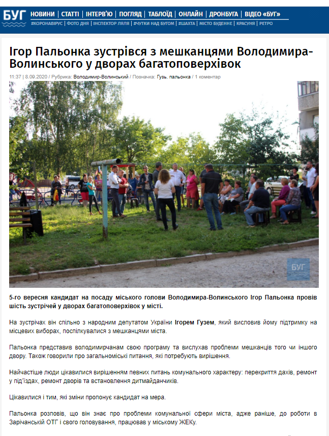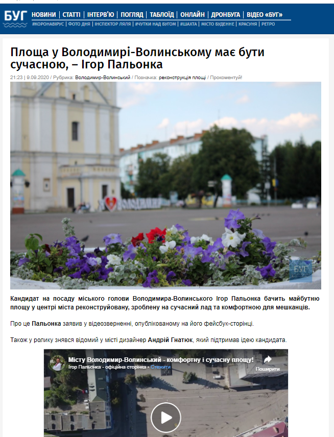 9 вересня «БУГ» опублікував новину із відеороликом за участі Ігоря Пальонки. У матеріалі його знову називають «кандидатом» та висвітлюють його бачення на зміни центральної площі Володимира-Волинського.