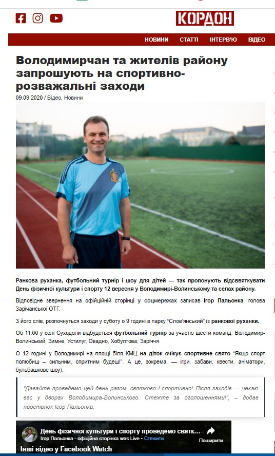 Також 9 вересня на шпальтах «Кордону» з’явилася публікація «Володимирчан та жителів району запрошують на спортивно-розважальні заходи» із відеороликом Ігоря Пальоки. Тут його іменують головою Зарічанської ОТГ, а не кандидатом. Однак у самому ролику потенційний кандидат зауважує, що у післяобідню пору відбудуться зустрічі у дворах, до яких запрошує долучитися.